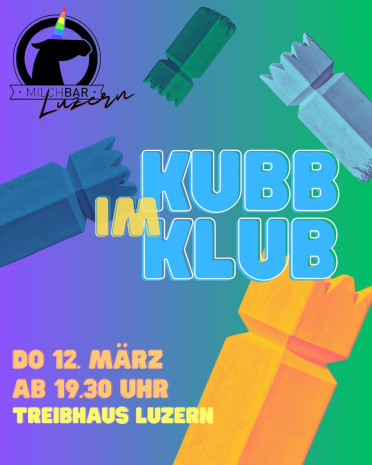 Die Milchbar Luzern bringt ihren Lieblingssport KUBB in eine neue Runde! Kubb, auch "Wikingerschach" genannt, ist ein skandinavisches Wurfspiel, bei dem zwei Teams versuchen, die Holzklötze des Gegners und am Ende den König in der Spielfeldmitte durch geschicktes Werfen von Stäben umzuwerfen.